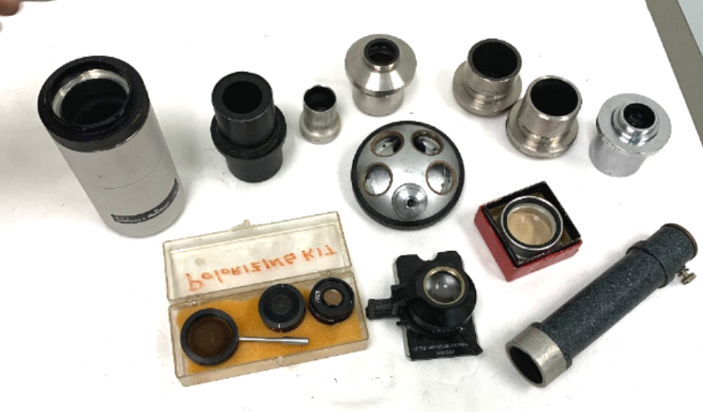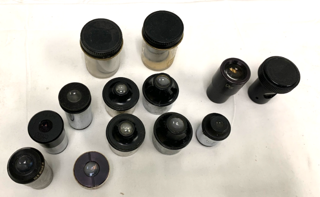 A large lot of vintage Microscope Eye pieces and other parts.
