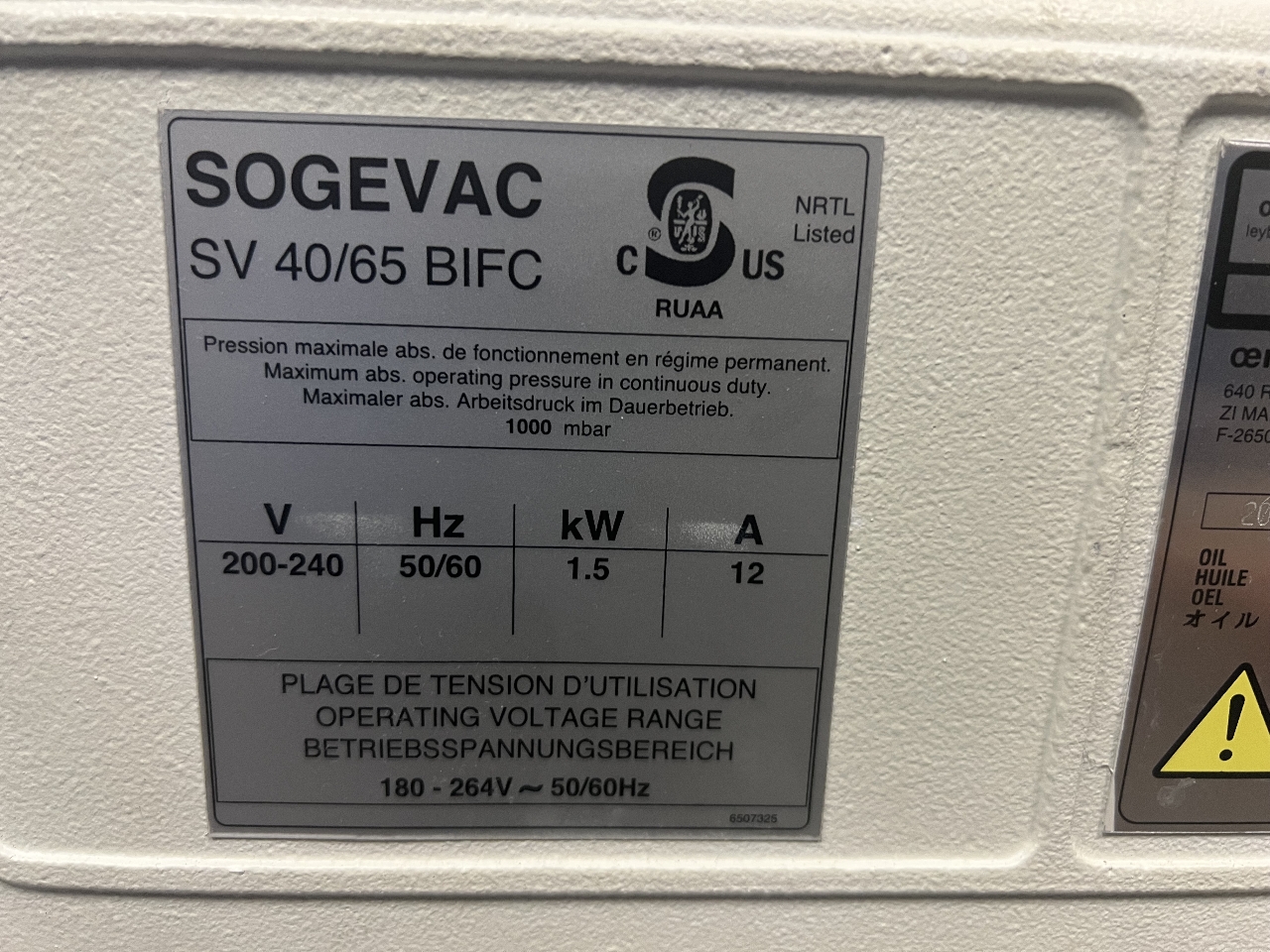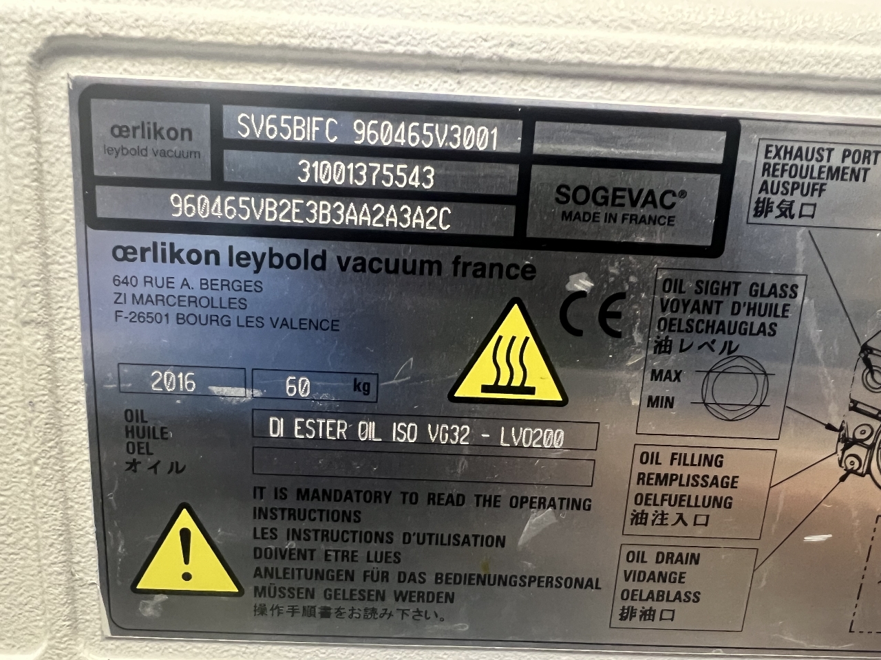 For Sale is a USED Leybold Sogevac SV65 BI FC Vacuum Pump200-240V 50/60HZ 1.5kW 12A
