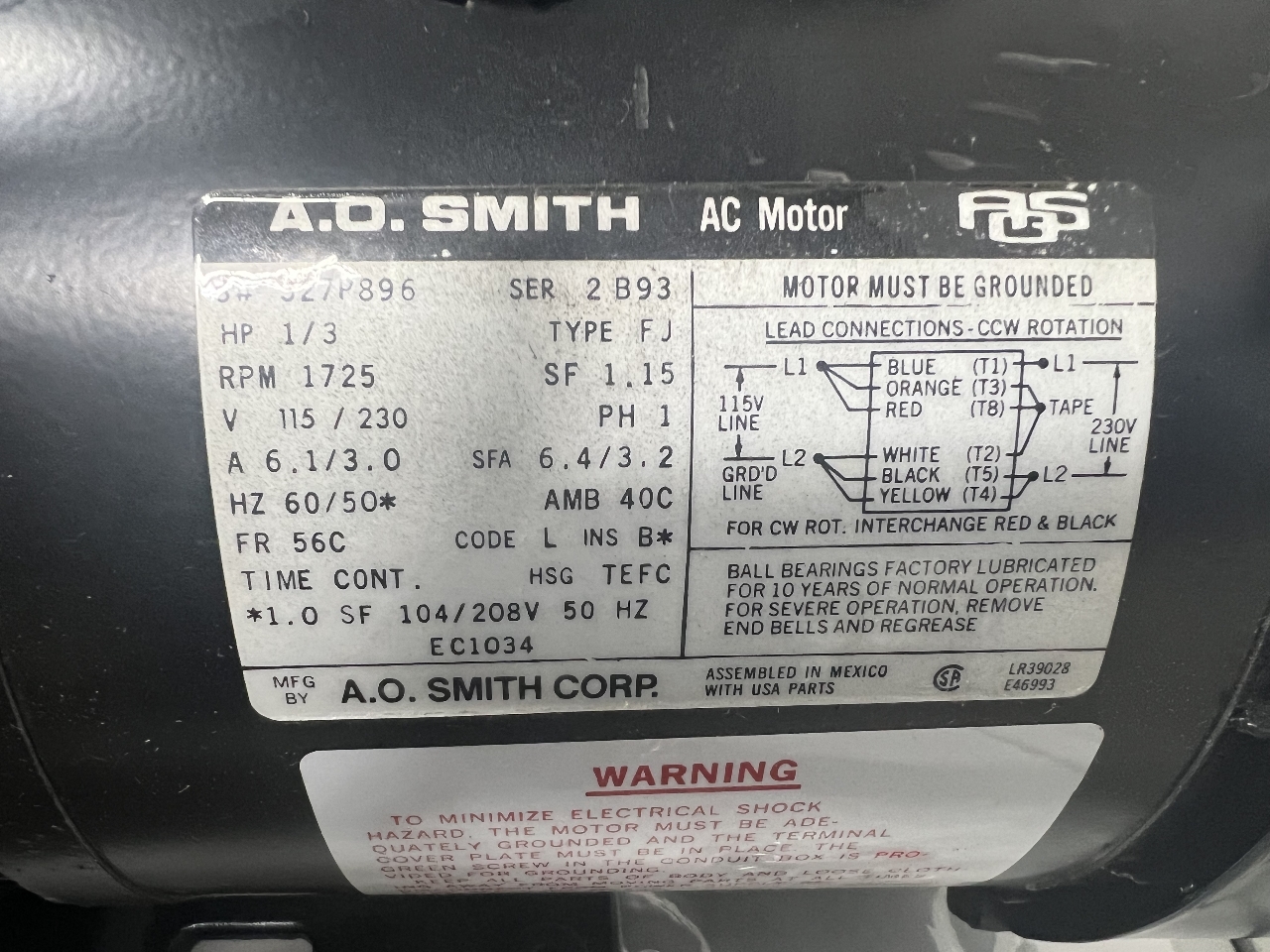 1 – NOS HYPERVAC 100 /AO Smith Motor 327P896 NEW Old Stock
