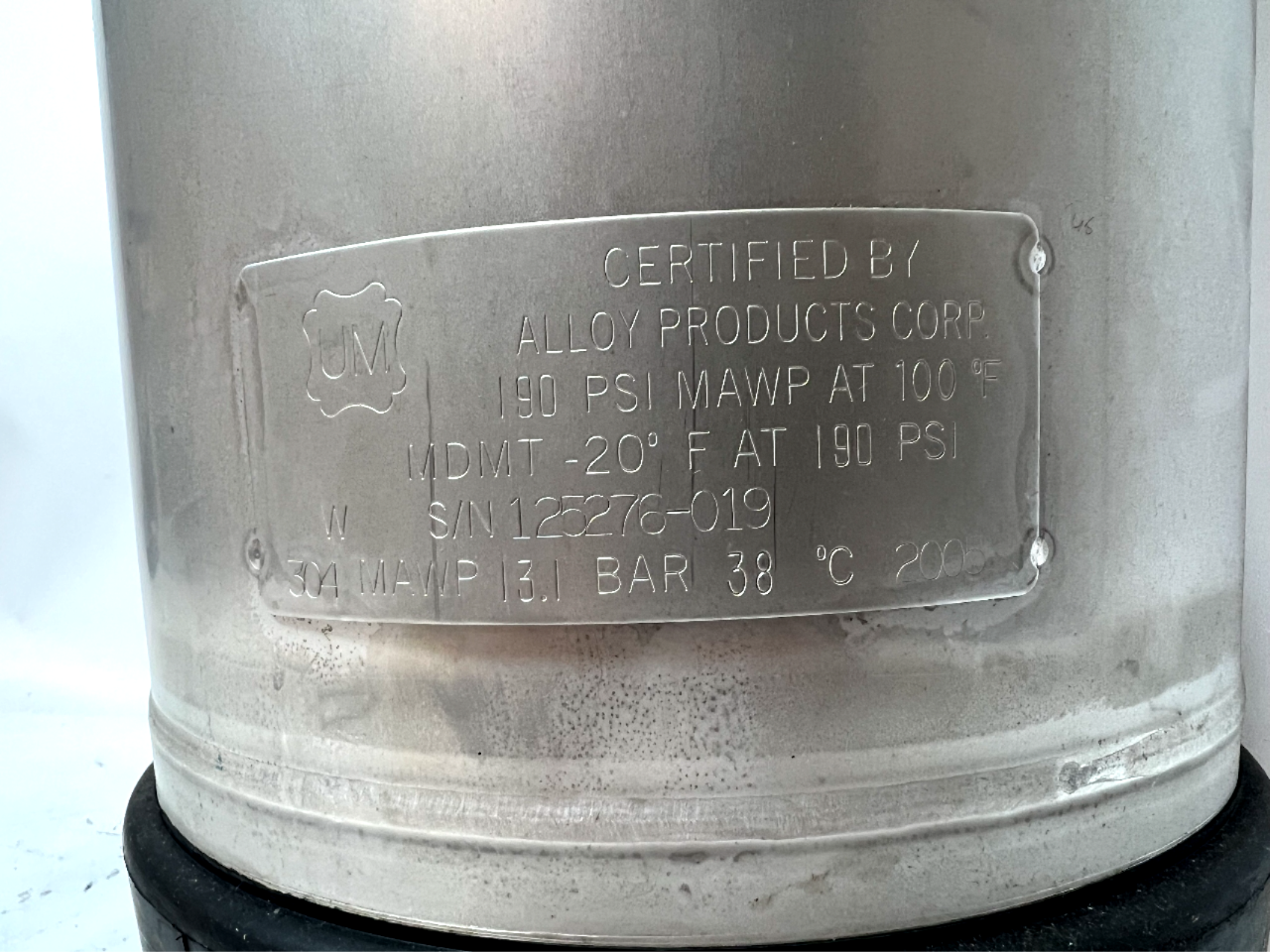 1 – Alloy Products 190 PSI MAWP at 100F 304 Storage Tank 2005
